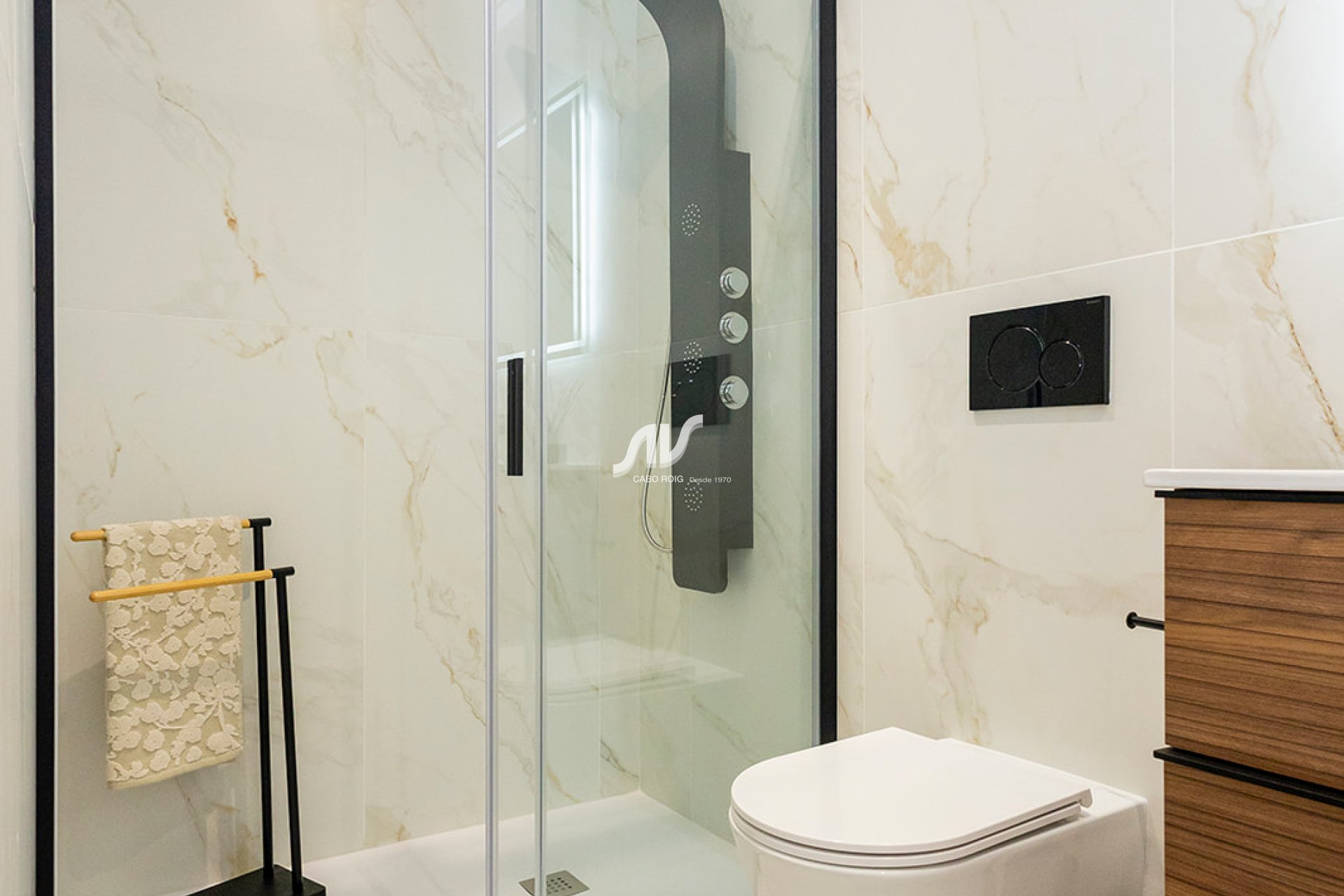 Das Innere der Reihenhäuser ist mit Liebe zum Detail gestaltet und bietet eine gemütliche und moderne Atmosphäre. Die Porzellanböden verleihen Eleganz und sind pflegeleicht. Die Aufteilung umfasst zwei Schlafzimmer und zwei Badezimmer, was ausreichend Platz für den Alltag bietet. Die Küchen sind mit Geräten ausgestattet, die den Alltag erleichtern. Einbauschränke bieten effiziente Stauraumlösungen, während elektrische Rollläden und die Video-Gegensprechanlage Komfort und Sicherheit hinzufügen. Die Vorinstallation der Klimaanlage ermöglicht es, das Raumklima an persönliche Vorlieben anzupassen. Zudem besteht die Möglichkeit, ein Solarium hinzuzufügen, um die Nutzungsmöglichkeiten des Raumes zu erweitern.