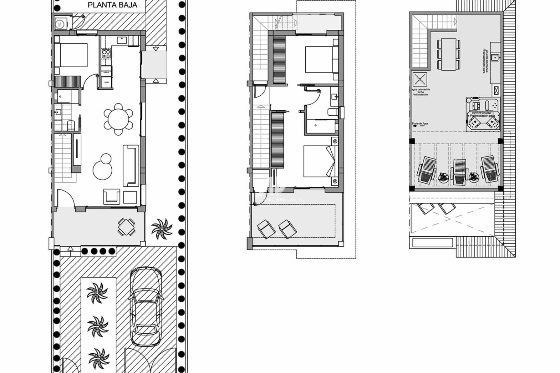 The exteriors of these homes have been designed to maximize enjoyment of the Mediterranean climate. Each property features a private garden, perfect for relaxing or enjoying outdoor activities. The presence of a private pool adds a touch of luxury, allowing for refreshing dips on the hottest days. Additionally, the homes have a terrace and a solarium, offering multiple spaces to relax or socialize outdoors. The inclusion of a pergola provides shade and style, creating a welcoming and elegant outdoor environment.