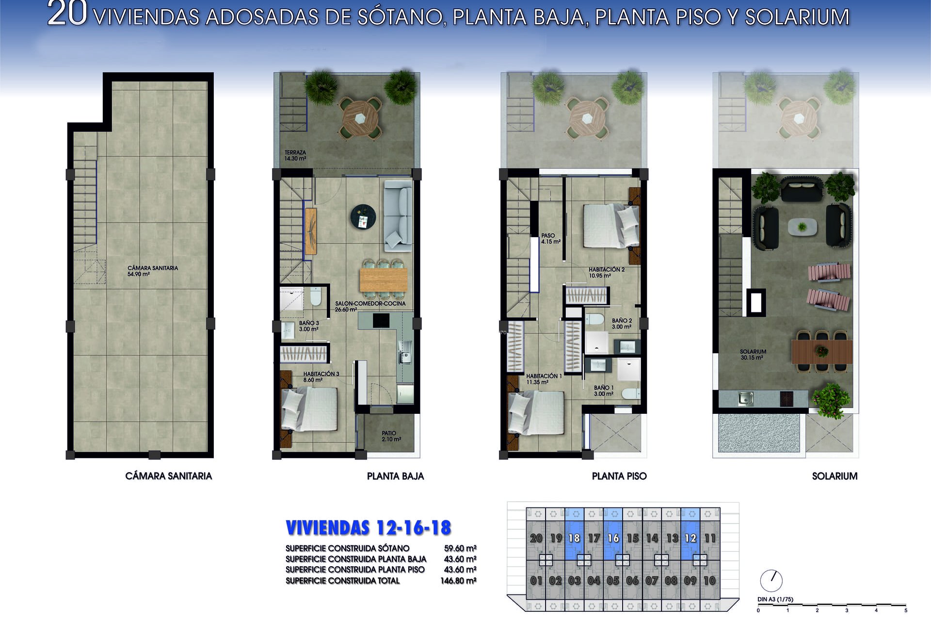 The outdoor spaces of these townhouses in Dolores are designed to maximize enjoyment of the Mediterranean climate. Each home features a private terrace, a perfect space to enjoy outdoor moments, whether relaxing, sharing with friends, or simply enjoying a dinner under the stars. Additionally, the solarium is a standout feature, providing additional space for sunbathing or creating a small urban garden. The exterior architecture harmoniously integrates with the surroundings, offering a modern design that complements the natural beauty of the area.