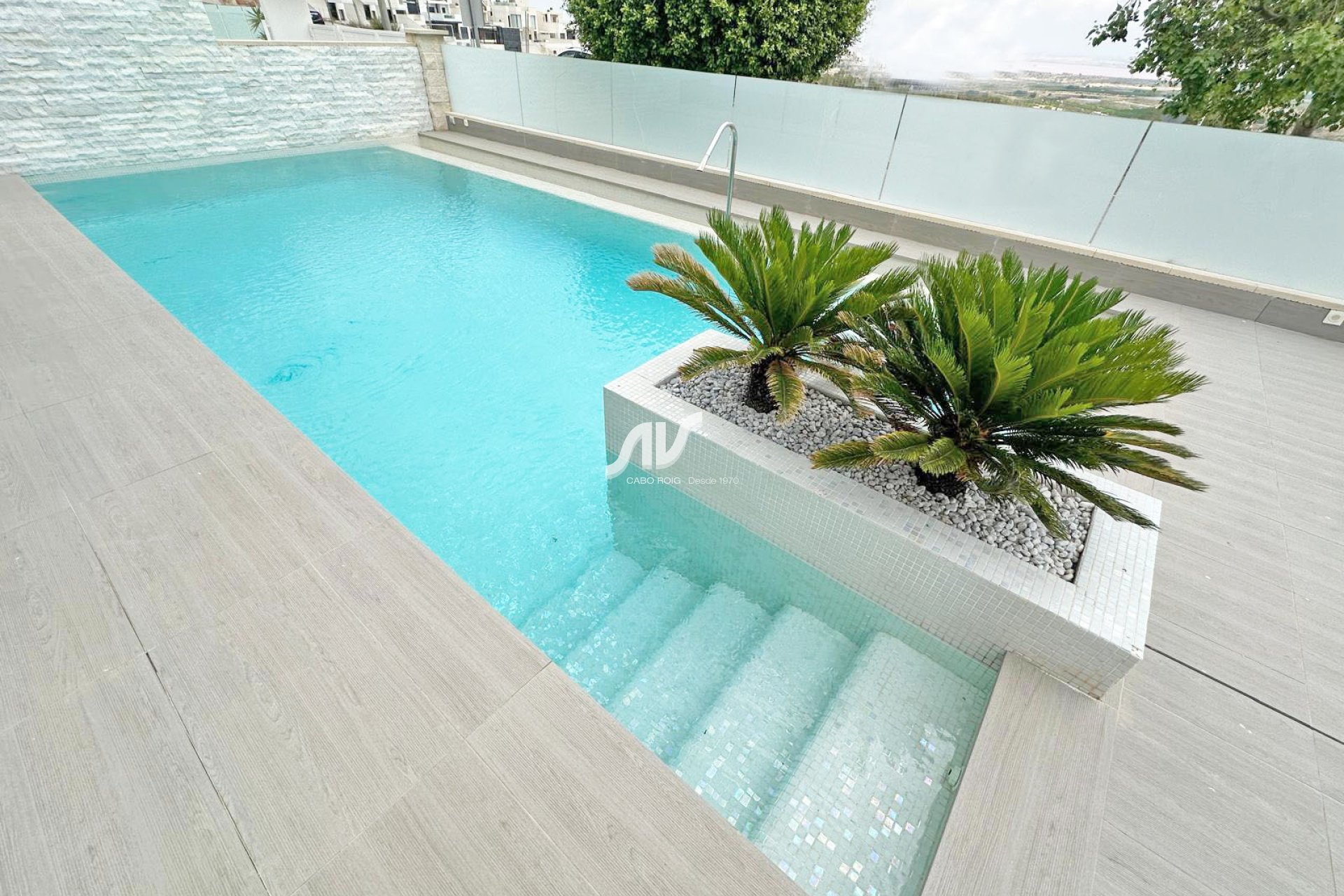 Exclusive modern design Villa with panoramic views in San Miguel de Salinas Located in an elevated position within the prestigious Ciudad de las Comunicaciones (City of Communications), this villa offers spectacular views of the Mediterranean Sea and the natural surroundings of Las Salinas. Just a 3-minute drive from the town center with all amenities—La Zenia Shopping Center, shops, restaurants, pharmacies, and a health center—it is very close to Orihuela Costa and less than 7 minutes from Torrevieja and its beaches. Las Colinas Golf Course is just 4 km away.