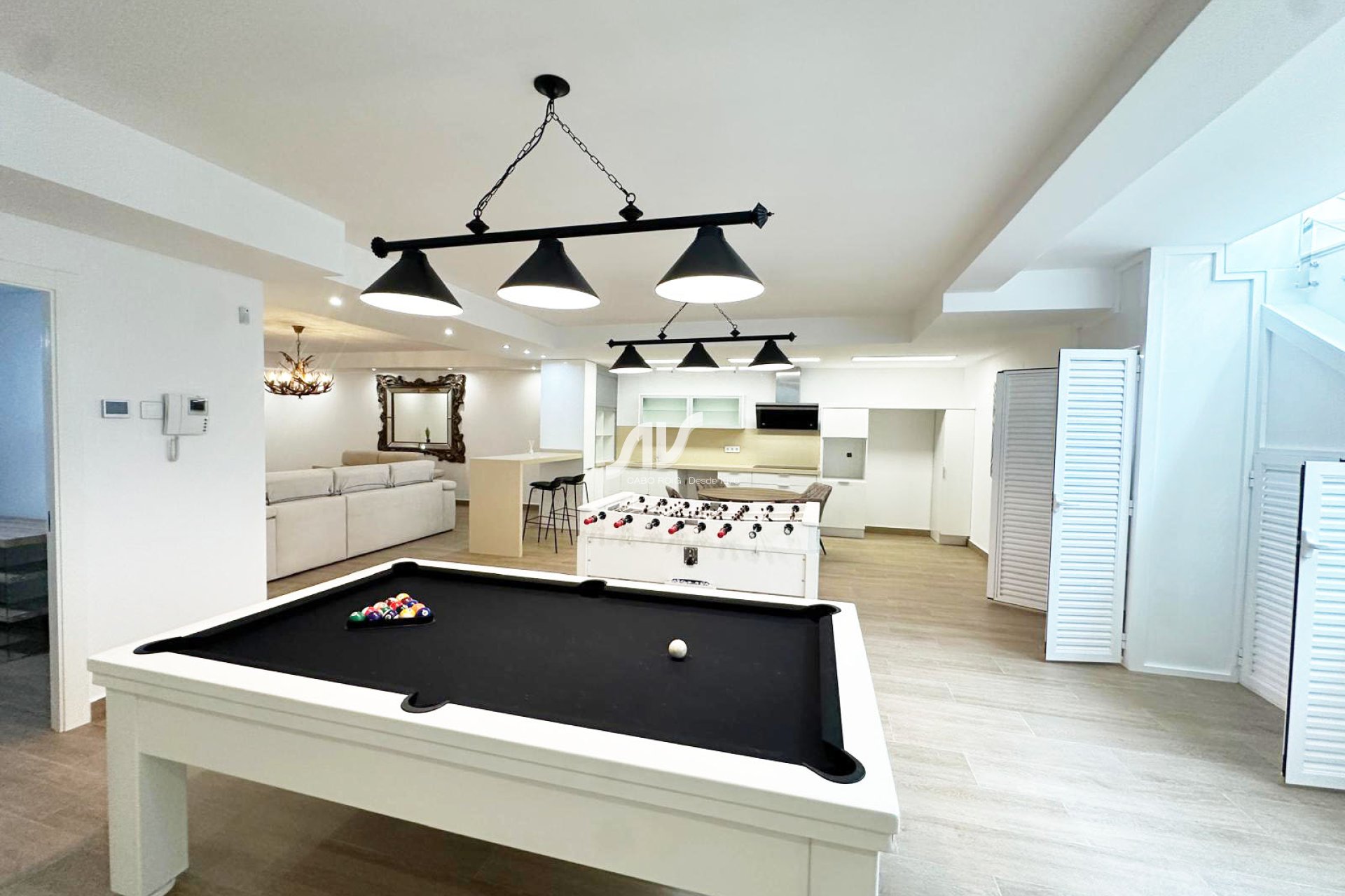 The modernly designed property has 5 bedrooms and 4 bathrooms spread over two floors plus a basement, connected by an elevator and a backlit glass interior staircase. The main living space features a spacious living-dining room with an open kitchen and a central island, and a master suite with a private bathroom. The basement includes a leisure area with a games room, function room, and private cinema.