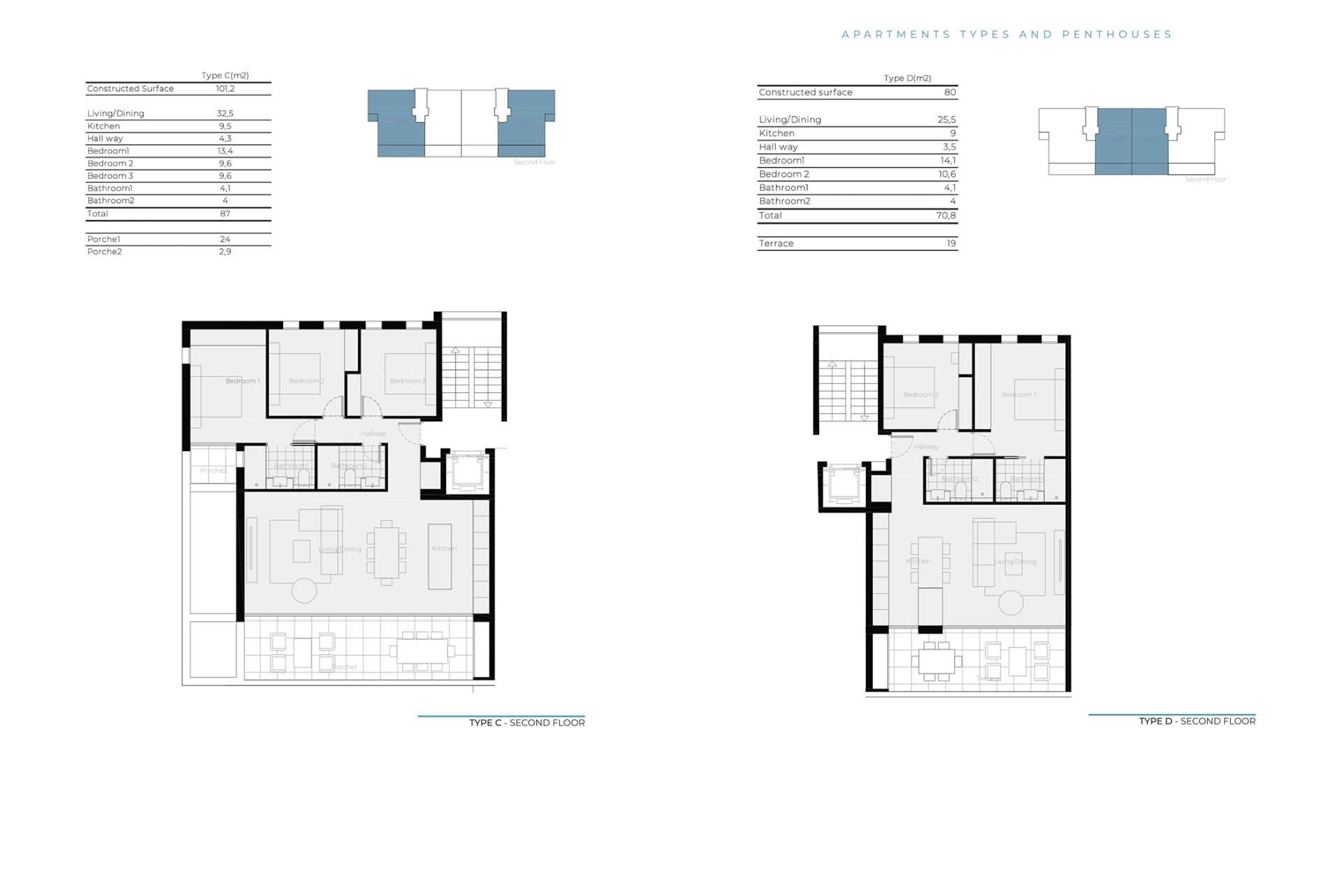 Interiøret i disse boligene er nøye designet for å tilby komfort og modernitet. Leilighetene, første etasjene og penthouseene er tilgjengelige i konfigurasjoner med 2 og 3 soverom, alle med 2 bad. Kjøkkenene er fullt utstyrt med moderne hvitevarer, og boligene er møblert, klare til innflytting. Klimaanlegget inkluderer aircondition og gulvvarme, som sikrer komfort hele året. Keramiske og porselensfliser gir et snev av sofistikasjon og er enkle å vedlikeholde. Elektriske persienner og videointercom gir et ekstra nivå av komfort og sikkerhet.