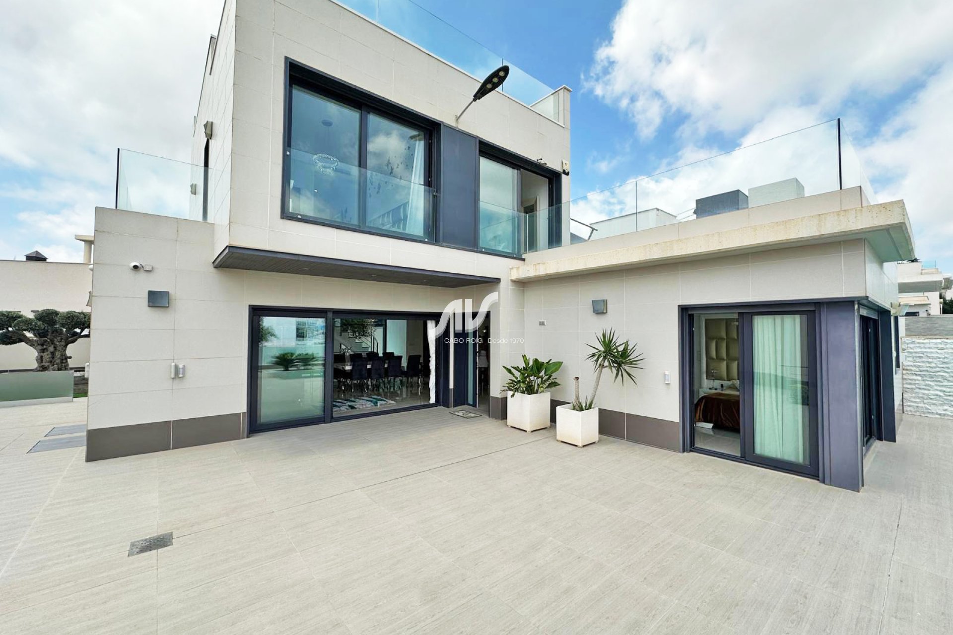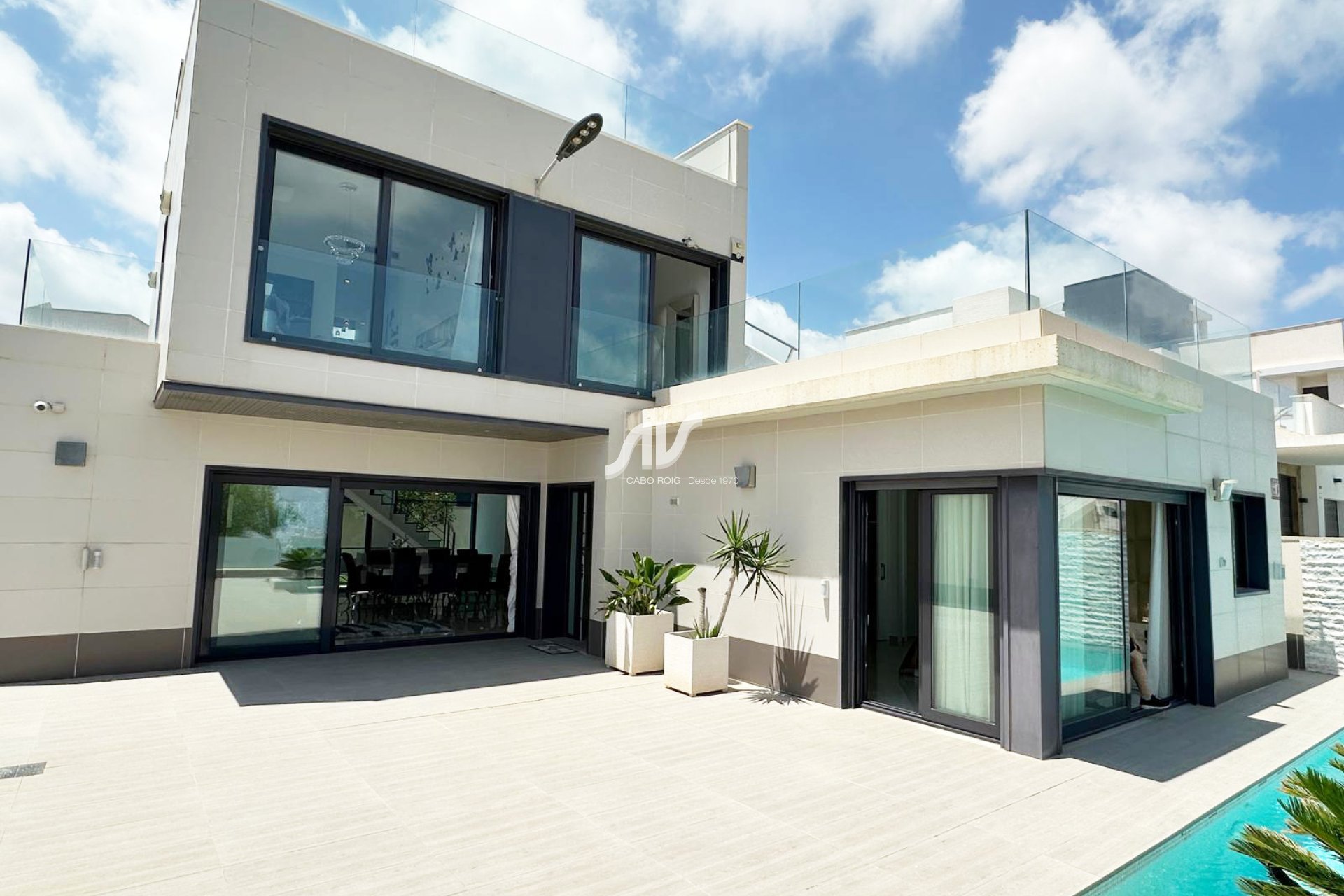 Denne villaen ligger på en høyde i det prestisjefylte Ciudad de las Comunicaciones og tilbyr spektakulær utsikt over Middelhavet og det naturlige landskapet i Las Salinas. Bare 3 minutters kjøring fra byens sentrum med alle fasiliteter — La Zenia kjøpesenter, butikker, restauranter, apotek og helsesenter — veldig nær Orihuela Costa og mindre enn 7 minutter fra Torrevieja og dens strender. Golfbanen Las Colinas ligger kun 4 km unna.