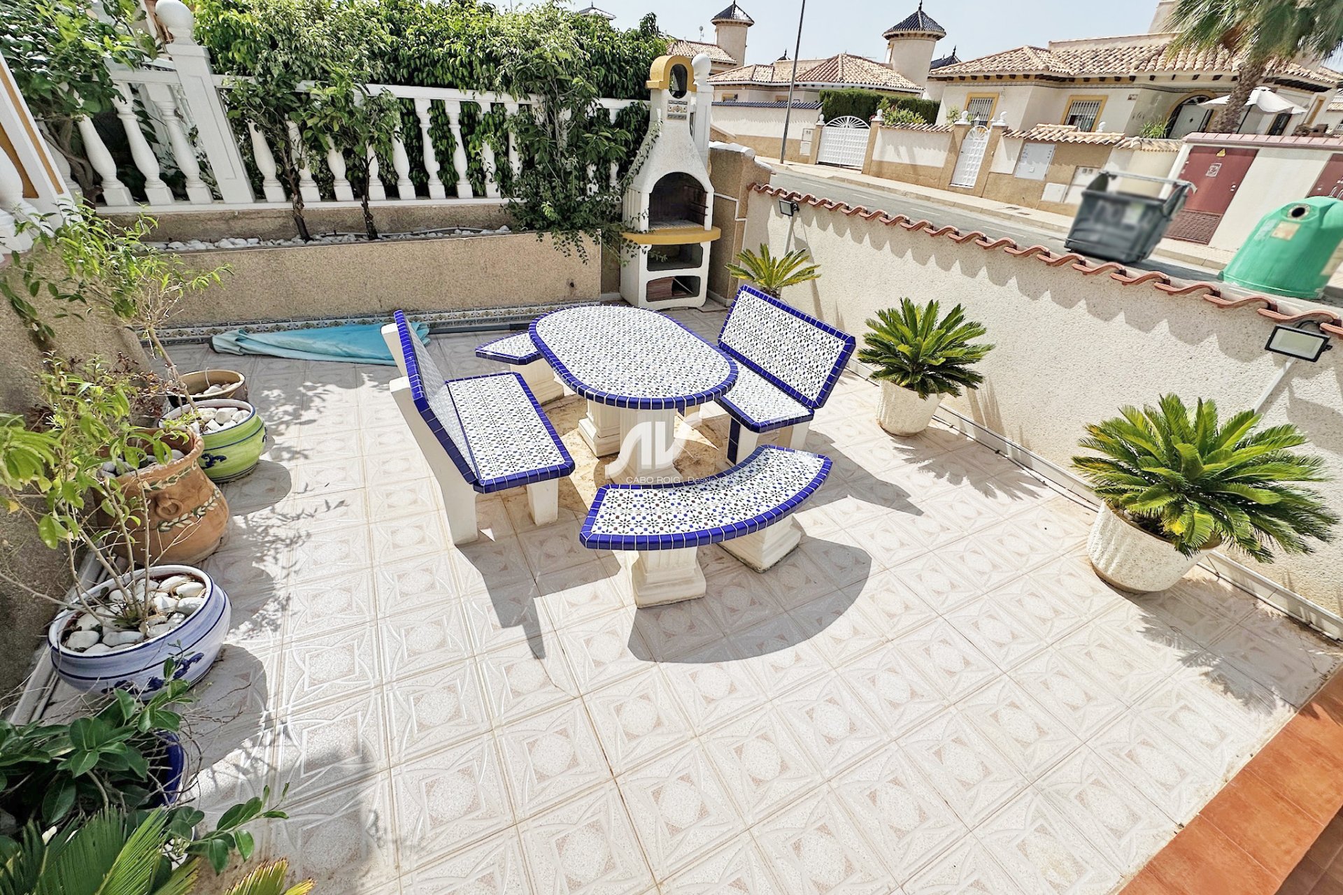 Eiendommen har en privat, brosteinslagt tomt på ca. 85 m², med plass til opptil tre biler. I tillegg en stor uteterrasse med grill, perfekt for å nyte middelhavsklimaet hele året.