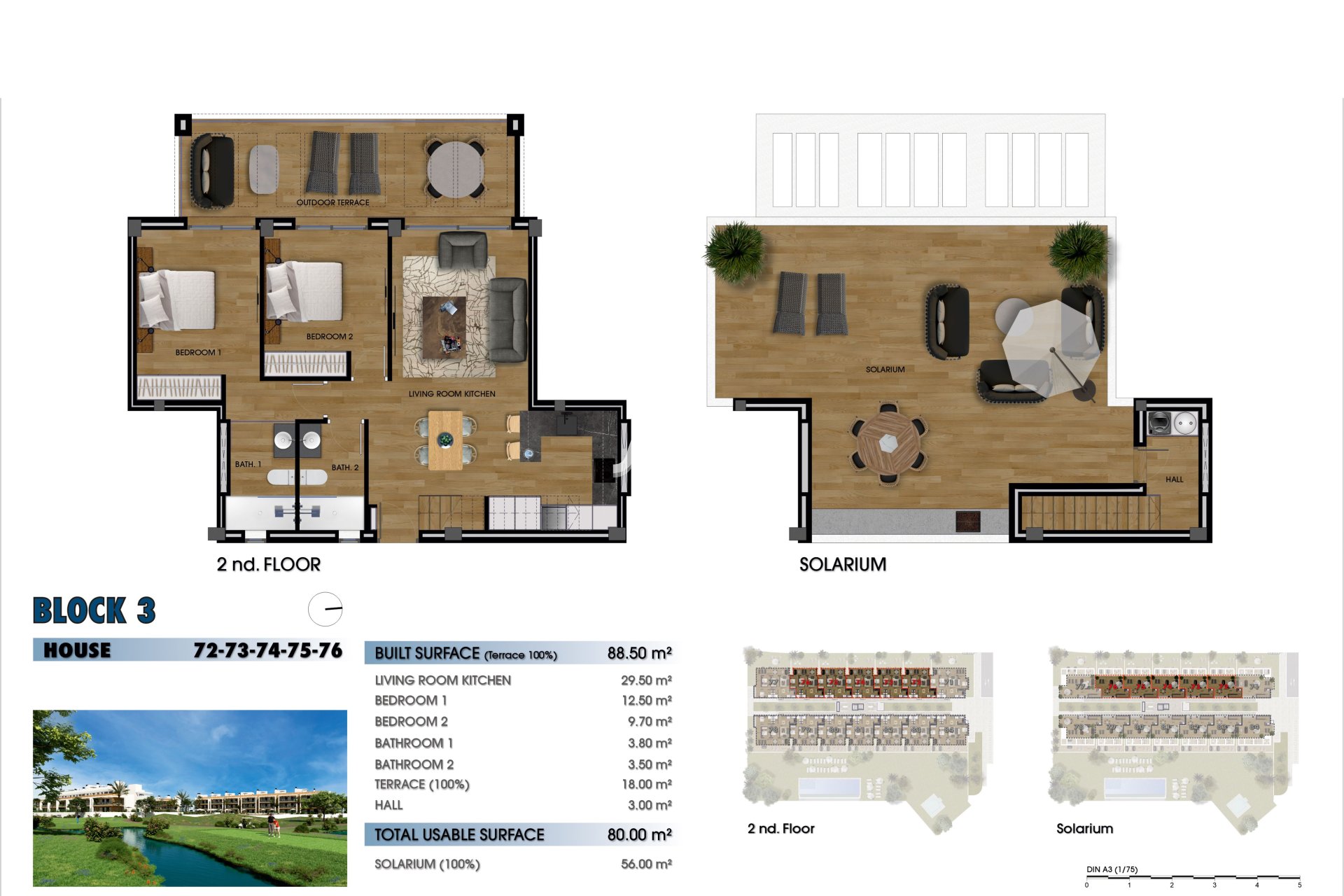 Interiøret i boligene er designet for å tilby maksimal komfort og funksjonalitet. Planløsningene inkluderer boliger med 2 og 3 soverom, alle med 2 bad, noe som sikrer tilstrekkelig plass for familier av forskjellige størrelser. Kjøkkenene er utstyrt med moderne hvitevarer, og klimaanlegget, sammen med ekstra forhåndsinstallasjon, garanterer et behagelig miljø året rundt. Elektriske persienner og videointercom gir et moderne preg og sikkerhet. Innebygde garderober tilbyr effektive lagringsløsninger, og holder rommene ryddige og fri for rot.