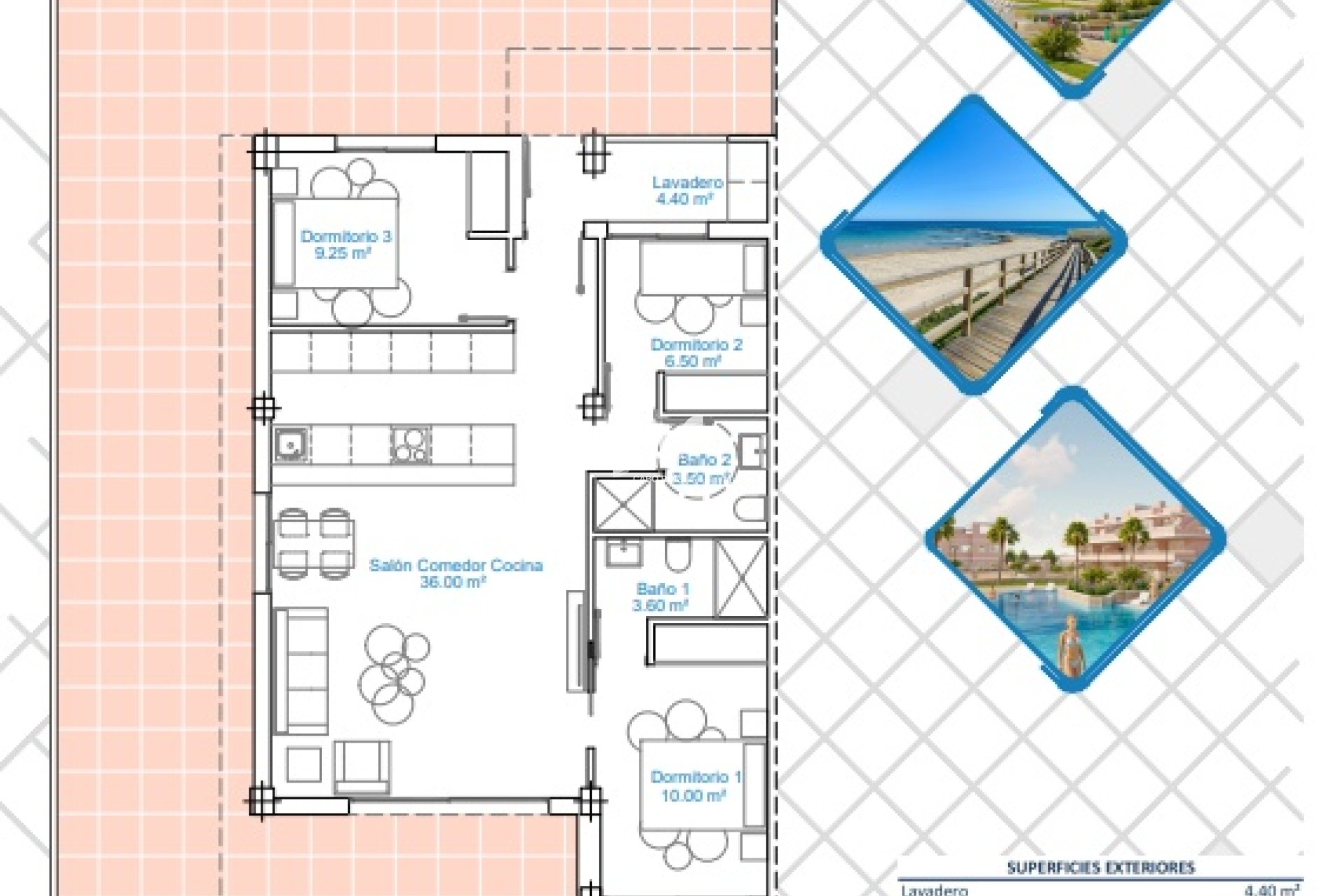 Ubicado en el encantador municipio de Pilar de la Horadada, este conjunto residencial ofrece una variedad de opciones de vivienda que se adaptan a diferentes necesidades. Con un total de 24 propiedades, los futuros residentes pueden elegir entre apartamentos, bajos, bungalows con solarium y bungalows con jardín. Esta diversidad tipológica asegura que cada familia o individuo encuentre su hogar ideal en un entorno que combina tranquilidad y accesibilidad. La proximidad al mar, a solo 2 km, permite disfrutar de la brisa marina y de agradables paseos por la costa. Además, el aeropuerto más cercano se encuentra a 48 km, facilitando los desplazamientos internacionales y nacionales. La ubicación estratégica de este residencial en Pilar de la Horadada lo convierte en una opción atractiva para quienes buscan un equilibrio entre comodidad y calidad de vida.