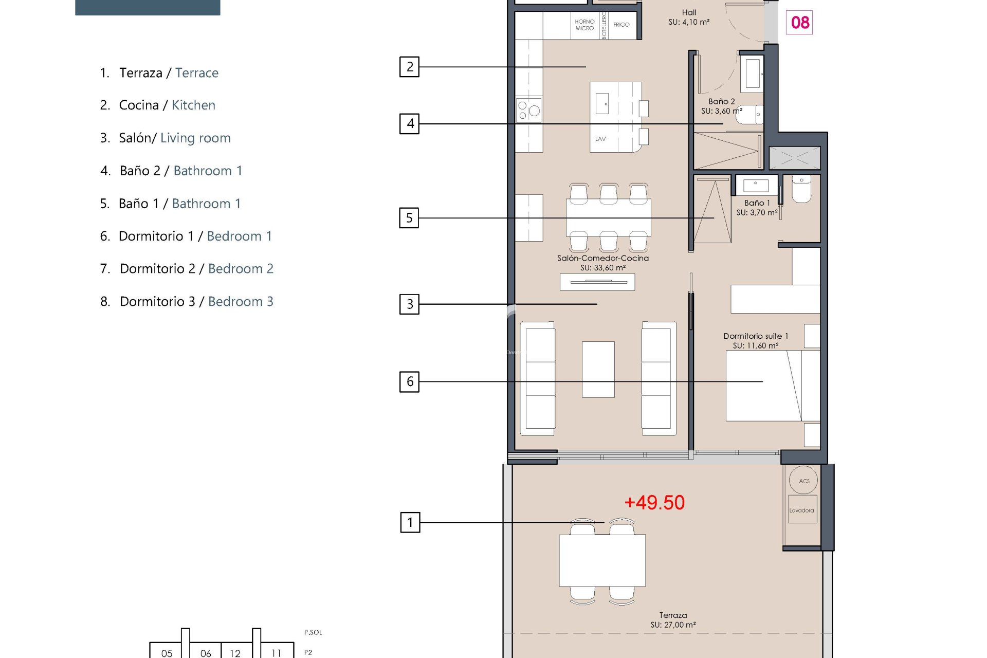 En el interior, las viviendas destacan por su diseño contemporáneo y funcional. Los apartamentos, plantas bajas y áticos cuentan con tres dormitorios y dos baños, ofreciendo un espacio amplio y bien distribuido para toda la familia. Los suelos de gres porcelánico aportan un toque de elegancia y son fáciles de mantener. Los armarios empotrados en los dormitorios proporcionan un almacenamiento eficiente, mientras que la preinstalación de aire acondicionado asegura un ambiente confortable durante todo el año. Cada detalle ha sido cuidadosamente considerado para ofrecer un hogar acogedor y moderno.