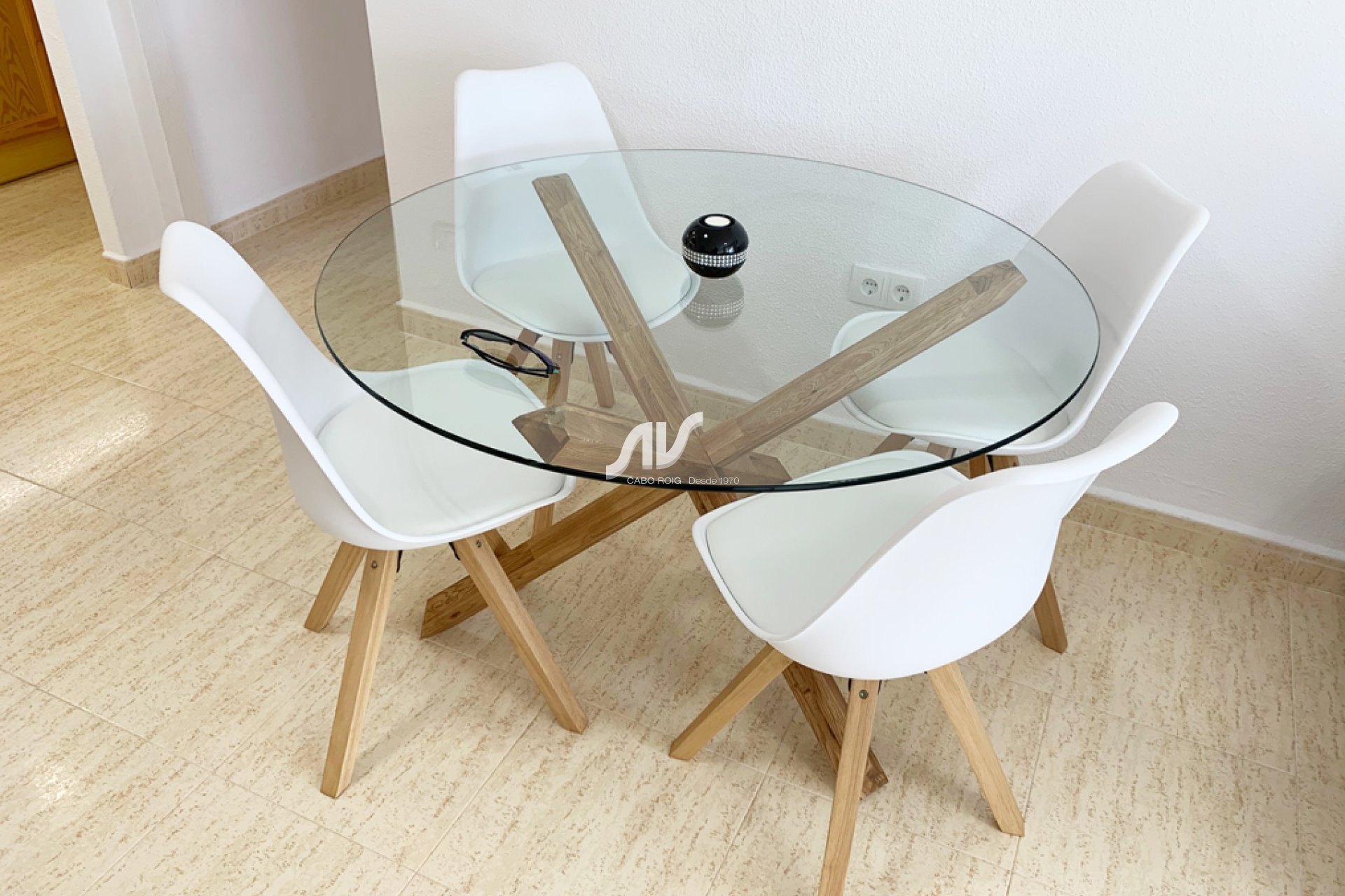 Apartamento en primera planta y orientación sur, como nuevo, con muebles y electrodomésticos de primera calidad y a estrenar, aire acondicionado, todas las habitaciones exterior, Situado en residencial con piscina comunitaria, zonas ajardinadas y gimnasio.
