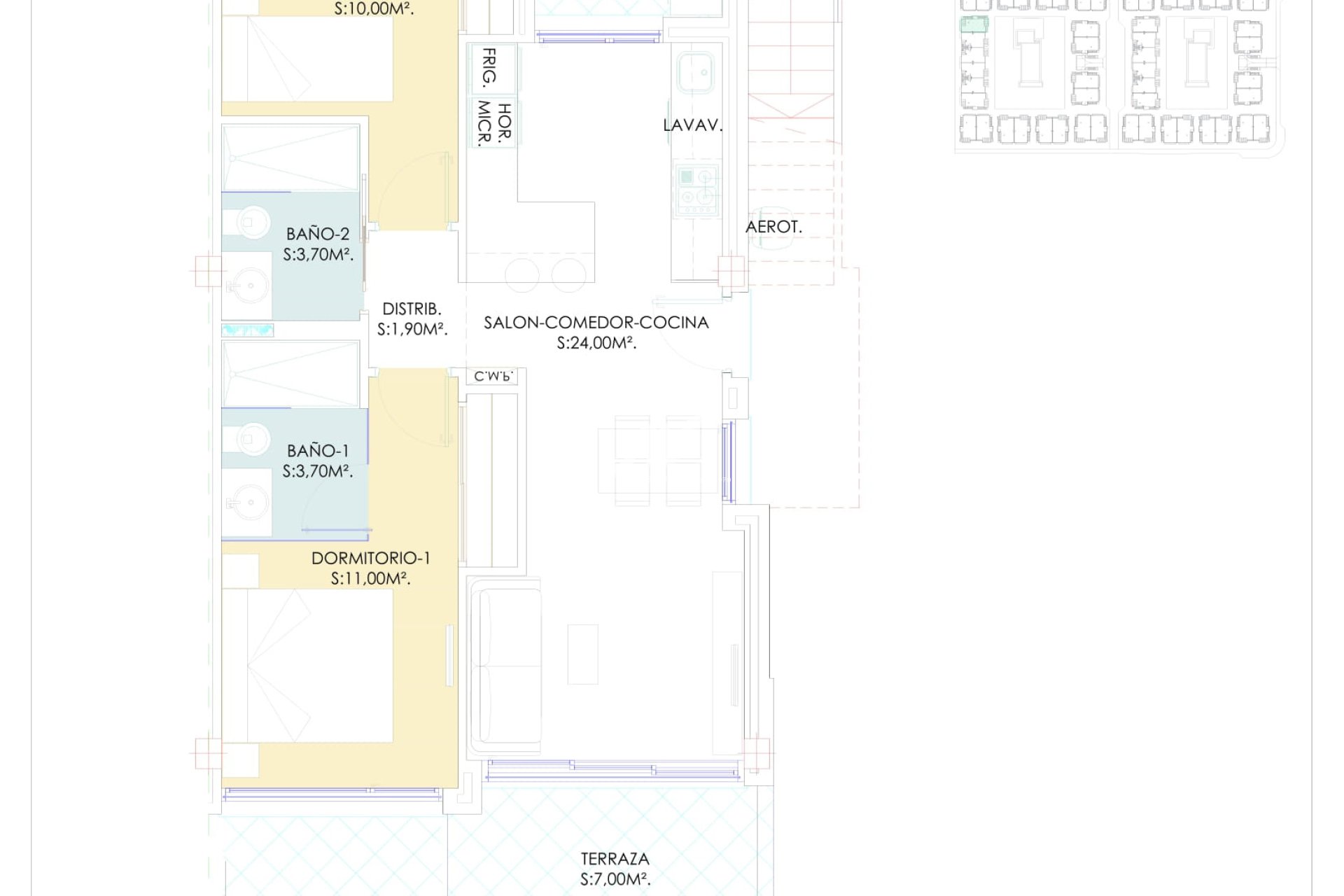 El interior de las viviendas está diseñado para ofrecer confort y estilo. Todas las propiedades vienen amuebladas, lo que facilita la mudanza y permite disfrutar del espacio desde el primer día. Los suelos de cerámica aportan un toque moderno y son fáciles de mantener. Las persianas eléctricas y los electrodomésticos incluidos son características que añaden comodidad a la vida diaria. Los armarios empotrados ofrecen un almacenamiento eficiente, mientras que la preinstalación de aire acondicionado asegura que el hogar esté preparado para cualquier clima.
