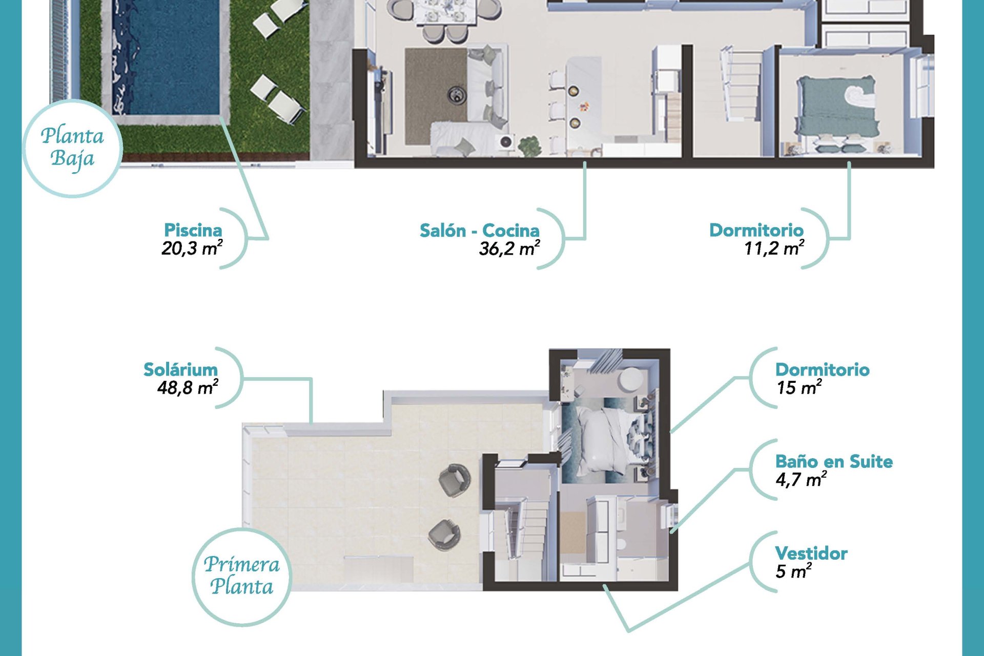 Los exteriores de estos adosados están pensados para maximizar el disfrute del clima mediterráneo. Cada vivienda cuenta con un jardín privado, ideal para crear un espacio verde personal o para disfrutar de momentos al aire libre. Las terrazas amplias ofrecen un lugar perfecto para relajarse, tomar el sol o disfrutar de comidas al aire libre. Además, cada adosado incluye un solárium, proporcionando un espacio adicional para disfrutar de las vistas y del clima soleado durante todo el año. La presencia de un garaje asegura comodidad y seguridad para el estacionamiento de vehículos.
