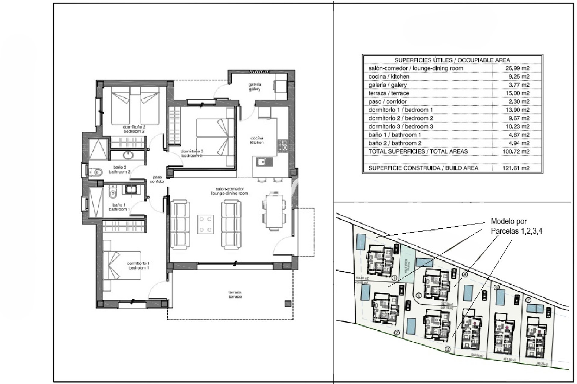 El interior de estas viviendas independientes en Rojales está diseñado pensando en la comodidad y el estilo. Cada propiedad cuenta con tres dormitorios, ofreciendo un espacio amplio y acogedor para toda la familia. Los dos baños están equipados para satisfacer las necesidades diarias con comodidad. Las viviendas incluyen armarios empotrados, que proporcionan un almacenamiento eficiente y mantienen el espacio ordenado. Además, cuentan con preinstalación de aire acondicionado, asegurando un ambiente agradable durante todo el año. La distribución también incluye un garaje, ofreciendo un espacio seguro para el estacionamiento y almacenamiento adicional.