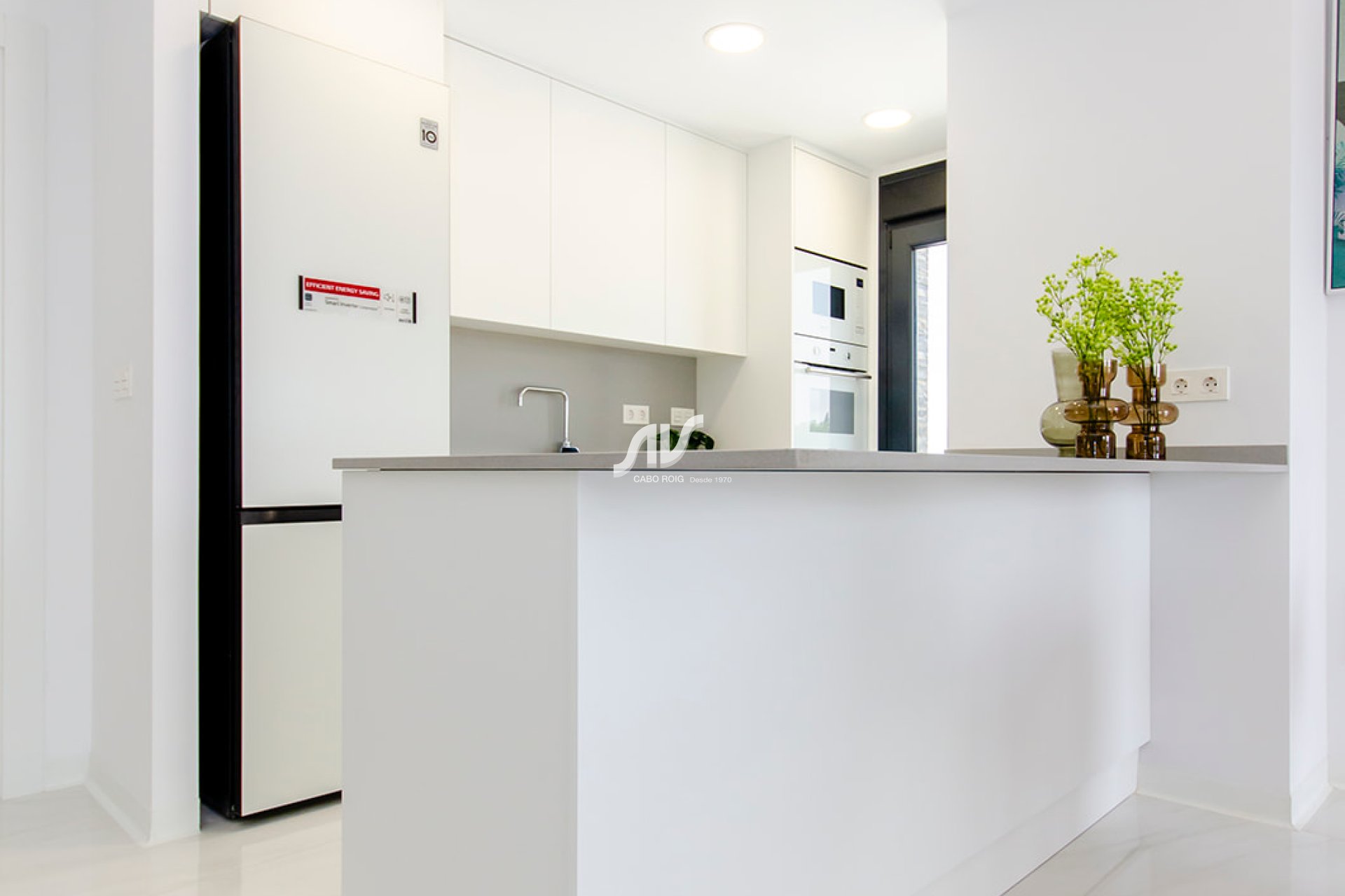 El interior de estas viviendas en Orihuela está diseñado con un enfoque en la comodidad y la funcionalidad. Los suelos de cerámica aportan un toque moderno y son fáciles de mantener. Las viviendas vienen completamente amuebladas, lo que facilita la mudanza y permite disfrutar del nuevo hogar desde el primer día. La cocina está equipada con electrodomésticos de alta calidad, y los armarios empotrados en los dormitorios ofrecen un amplio espacio de almacenamiento. El sistema de aire acondicionado, junto con la preinstalación adicional, asegura un ambiente agradable durante todo el año. Las persianas eléctricas y el videoportero añaden un nivel extra de confort y seguridad.