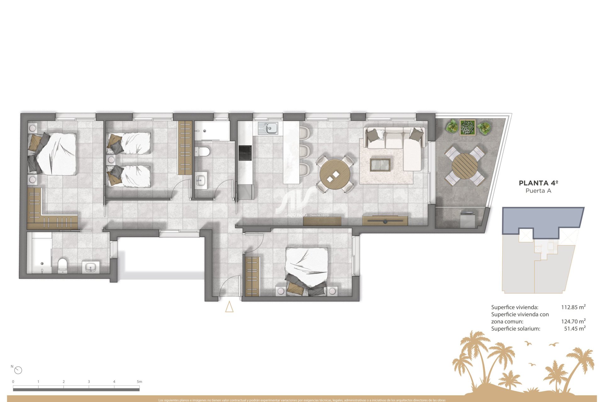 Los exteriores de este residencial en Guardamar del Segura están pensados para ofrecer un estilo de vida mediterráneo. Las propiedades cuentan con terrazas privadas, ideales para disfrutar de las vistas al mar y del clima soleado. Además, los áticos disponen de solárium, proporcionando un espacio adicional al aire libre para relajarse o socializar. La ubicación en primera línea de playa permite un acceso inmediato al mar, convirtiendo cada día en una oportunidad para disfrutar de la naturaleza y el entorno. Los suelos de cerámica en las áreas exteriores aseguran durabilidad y un mantenimiento sencillo, complementando el diseño moderno de las viviendas.
