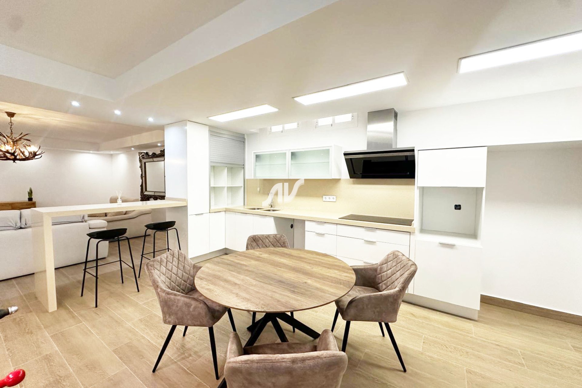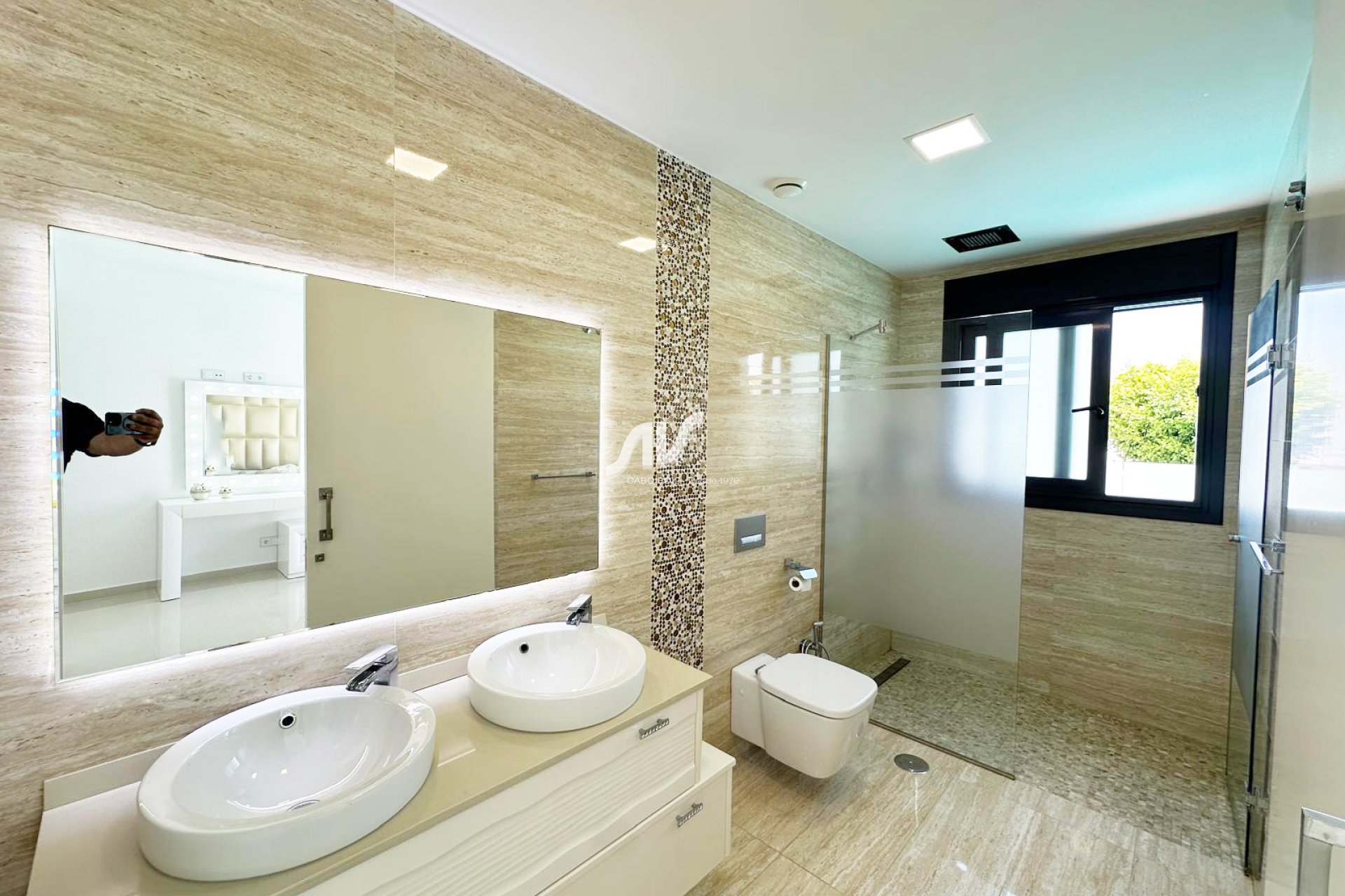 La propiedad, de diseño moderno, cuenta con 5 dormitorios y 4 baños distribuidos en dos plantas más sótano, conectadas mediante ascensor y una escalera interior de cristal retroiluminada. El espacio principal dispone de un amplio salón-comedor con cocina abierta e isla central, y una suite principal con baño privado. En el sótano se encuentra una zona de ocio con sala de juegos, sala de celebraciones y cine privado.